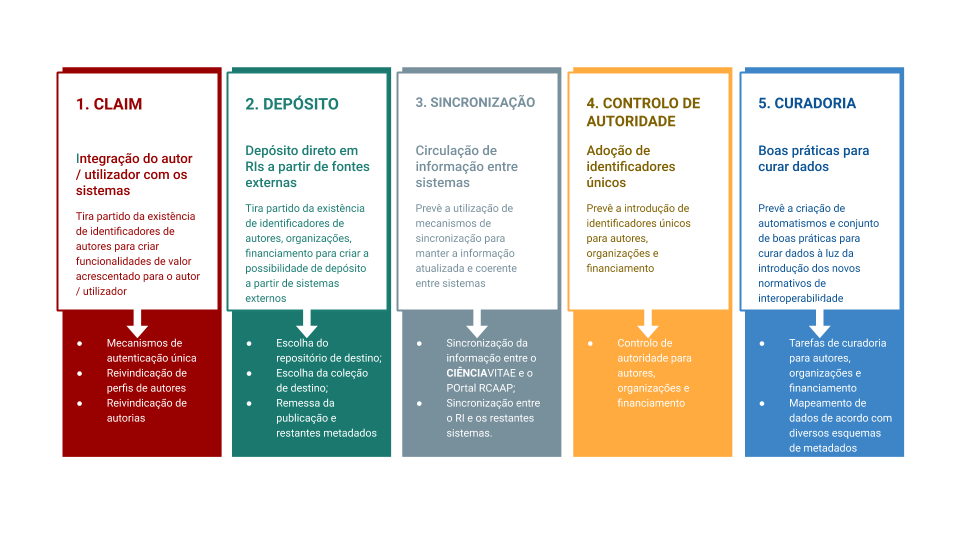 Esta integração resulta da intervenção que tem vindo a ser efetuada nos diversos sistemas (plataforma CIÊNCIAVITAE, Portal RCAAP, Repositórios) e que têm por base um roadmap baseado em blocos de casos de uso.