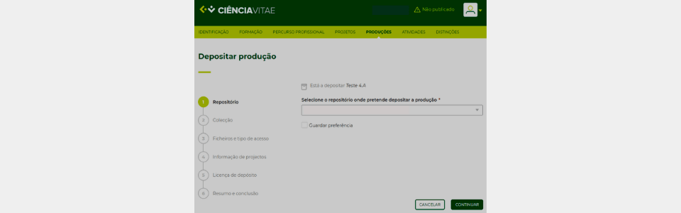 A disponibilização da funcionalidade de depósito em Repositório Institucional a partir do CIÊNCIAVITAE prevê que os utilizadores desta plataforma possam optar por enviar para os repositórios onde estão afiliados, trabalhos passíveis de depósito. O processo envolve 3 momentos: