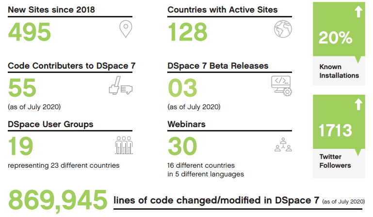 Nos últimos 18 meses, foram feitos progressos no desenvolvimento e lançamento do DSpace 7, que se encontra agora em Beta (DSpace 7.0 Beta 3). Construir e sustentar uma Comunidade forte é um objetivo estrutural para o DSpace Program, tendo por base representantes de organizações membro que planeiam, implementam, desenvolvem e sustentam o software com contributos de diversos grupos de trabalho.