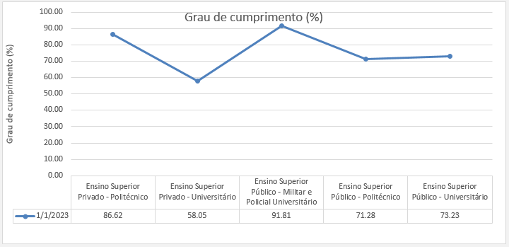 Ao efetuarmos um análise por subsistema, apura-se que a percentagem de cumprimento no Ensino Superior Público – Militar e Policial Universitário é de 91.81%, no Ensino Superior Privado – Politécnico é de 86.62&, no Ensino Superior Público – Universitário é de 73.23%, no ensino Superior Público – Politécnico é de 71.28% e no Ensino Superior Privado – Universitário é de 58.05%, como se pode observar no seguinte gráfico: